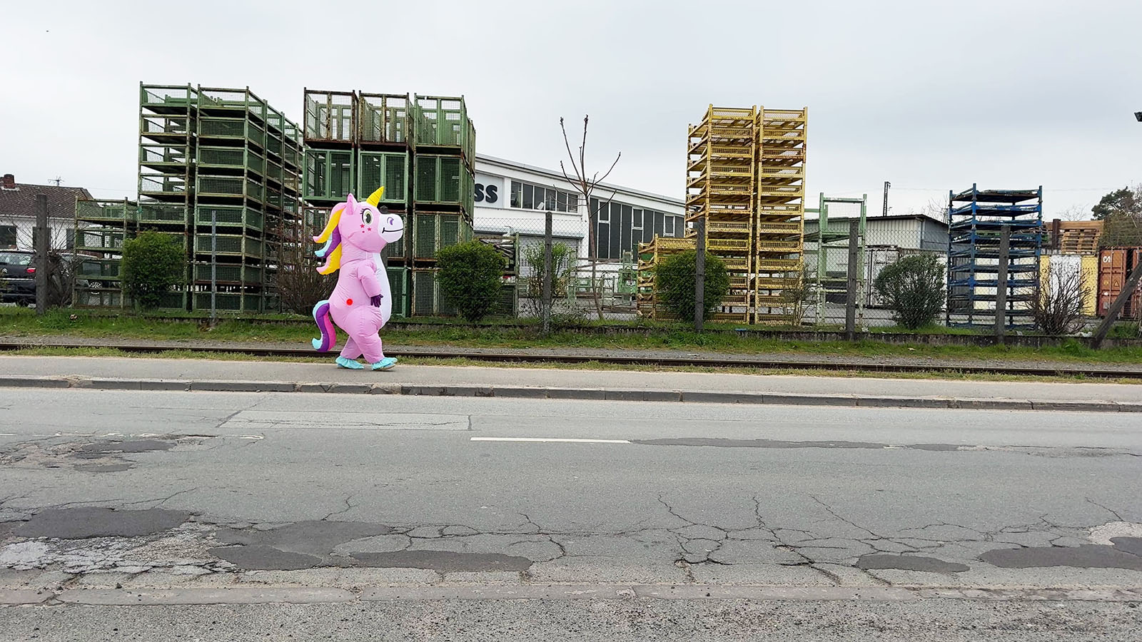 Im Rahmen ihres Aufenthalts arbeitete sie mit dem in Darmstadt ansässigen Fotografen Andreas Zierhut zusammen, um die Serie „Re-Negotiating Space / Unicorn“ zu realisieren, in der der städtische Raum Darmstadts als Ort fortlaufender Verhandlungsprozesse verstanden wird. Fragen nach dem Selbstverständnis des Menschen im Verhältnis zur Natur kreuzen sich hier mit ökologischen Imperativen, während gleichzeitig divergierende Visionen innerhalb der städtischen Gesellschaft hinsichtlich der Nutzung des öffentlichen Raums im Spannungsverhältnis zu den städtebaulichen und politischen Interessen der Stadt stehen. Sie reagiert darauf mit einer performativen Intervention im städtischen Umfeld, indem sie sich in einem Einhornkostüm an diesen Orten in Szene setzt.